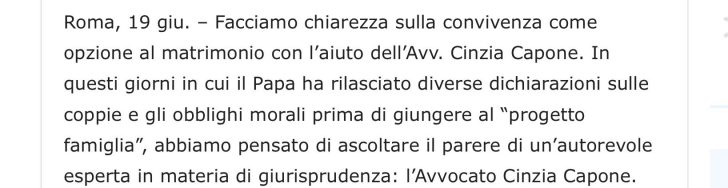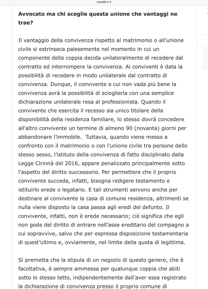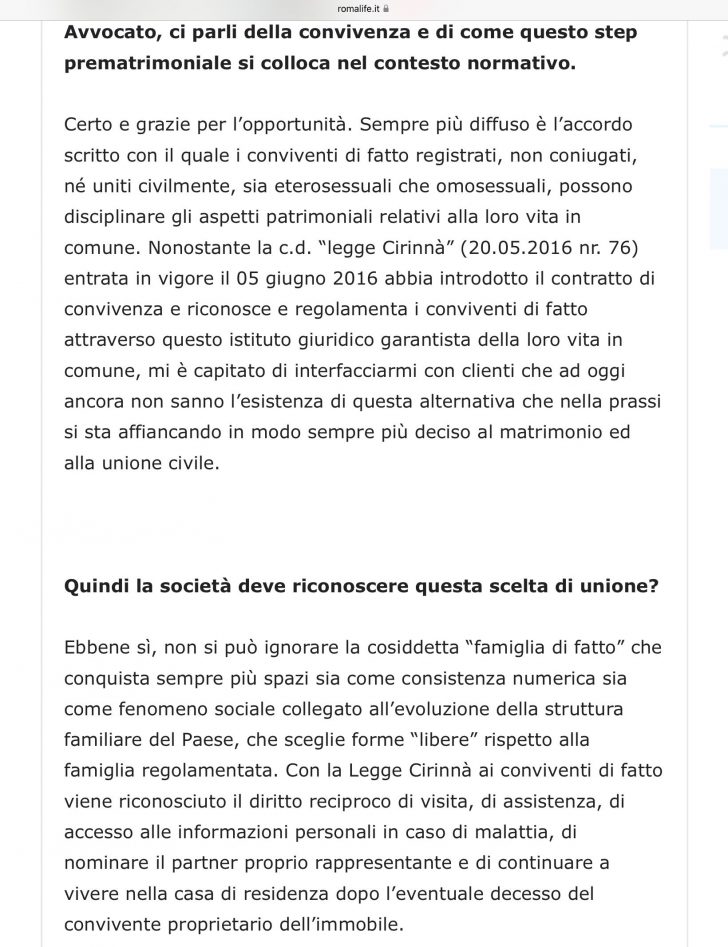 Grazie ad AgenPress ho potuto dare il mio punto di vista e mettere un punto in merito al dibattuto tema della convivenza matrimoniale, anche alla luce delle dichiarazioni rese del Papa sugli obblighi morali di una coppia prima di convolare a nozze. L’intervista è stata molto approfondita e mi è stata data la possibilità di approfondire molteplici aspetti della questione, soprattutto dal punto di vista normativo più che morale.