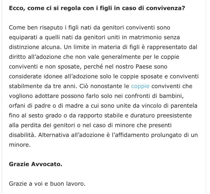 In seguito, il focus dell’intervista si è spostato sulla spinosa questione dei figli. In tal senso, ci ho tenuto a ribadire che in virtù delle nuove disposizioni legislative, introdotte già con legge 219\2012, non c’è più alcune differenza nè nello status che nel trattamento giuridico degli stessi. Si continueranno ad applicare tutte le tutele previste per i figli nati all’interno del matrimonio.