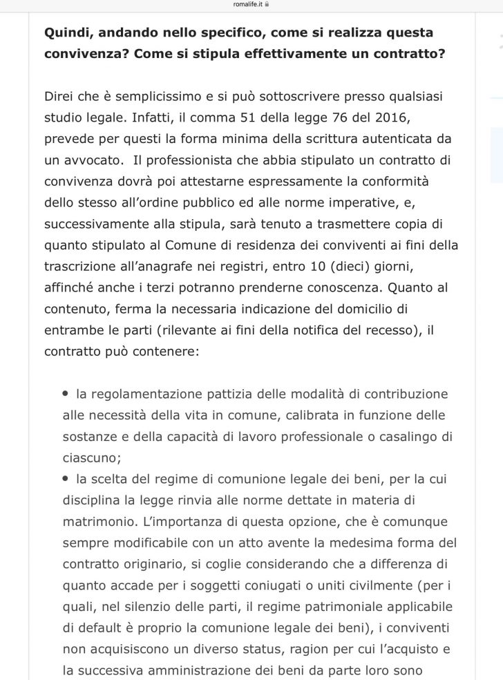 Innanzitutto, ci ho tenuto a precisare che la c.d. Legge Cirinnà, introdotta nell’ordinamento con Legge 76/2016 non è ancora conosciuta da un numero sufficiente di cittadini, i quali fanno ancora confusione in merito alla reale portata della famiglia di fatto, ritenendola piuttosto una possibilità concessa solamente alle coppie omosessuali. La legge Cirinnà, invece, ha portato un’evoluzione clamorosa all’interno dell’ordinamento, espandendo quei diritti di assistenza – soprattutto in caso di malattia – che erano altrimenti estranei al concetto di famiglia. L’unione di fatto è sostanzialmente un contratto che può essere sottoscritto presso qualsiasi studio legale, con una forma minima, che il professionista ha poi l’obbligo di trasmettere al Comune di residenza affinché lo iscriva all’interno dei registri in 10 giorni, per farne prendere conoscenza.