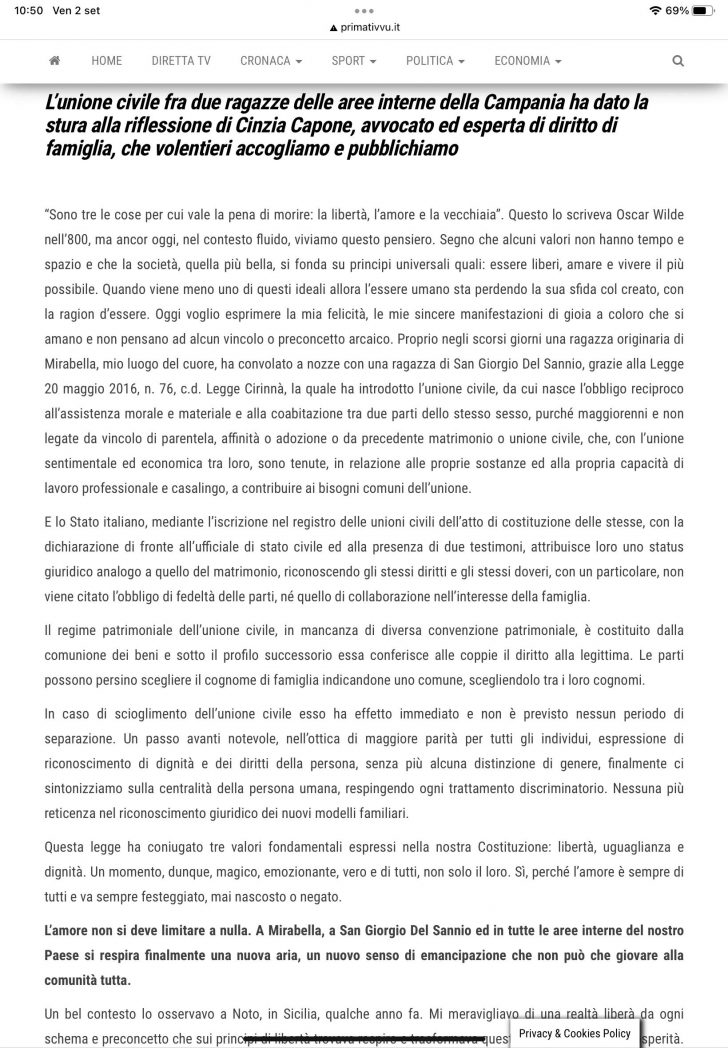 Cari lettori, vorrei condividere alcune brevi riflessioni in merito alla recente unione civile fra due ragazze della Campania, evento che segna un importante passo avanti verso l’affermazione di valori universali, quali la libertà e il poter vivere con consapevolezza.