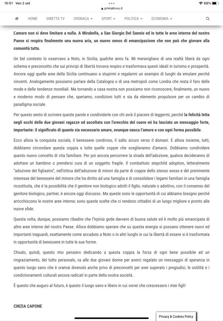 Vorrei, pertanto, esprimere la mia felicità e augurare a queste ragazze, originarie di Mirabella e di San Giorgio Del Sannio il meglio. Del resto tutte le persone che si amano meritano di compiere scelte importanti, senza alcun vincolo o preconcetto arcaico.