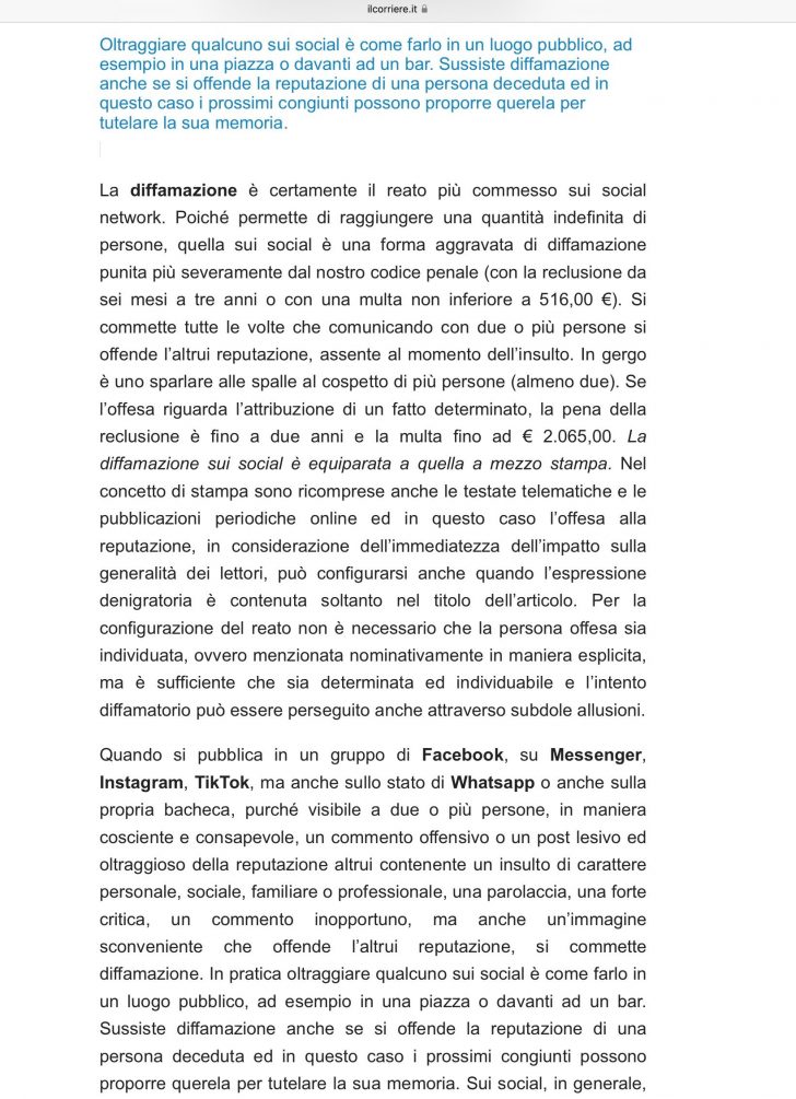 queste mie riflessioni si rivolgono a coloro che vogliono sapere come difendersi dalle diffamazioni su Facebook e altri social network. Il primo aspetto da evidenziare è che offendere qualcuno online è come farlo in un luogo pubblico, ad esempio davanti a un bar o in una piazza. Si può ledere la reputazione anche delle persone decedute e in queste situazioni i prossimi congiunti possono intraprendere le azioni più opportune.