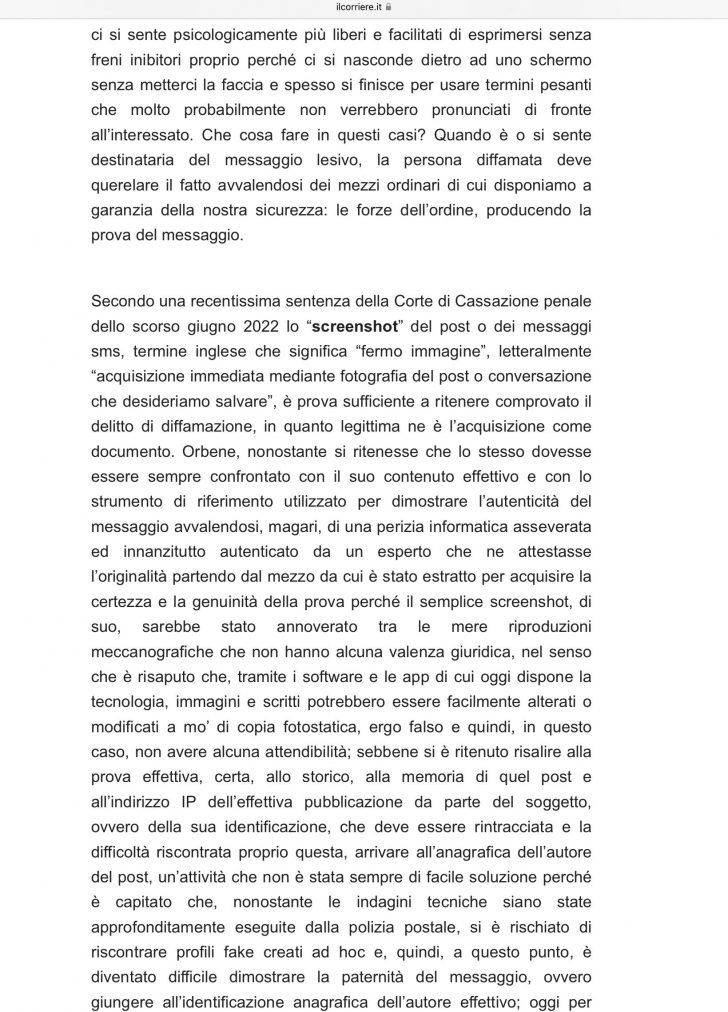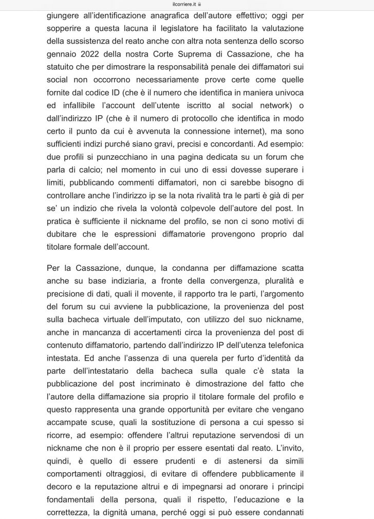 Al giorno d’oggi ci si sente liberi di esprimere qualsiasi pensiero e opinione sul web, tante volte senza alcun freno, proprio perché si cerca di nascondersi dietro uno schermo. Sul punto è intervenuta la Cassazione che, con la pronuncia dello scorso 22 giugno, ha specificato come non occorrono prove certe, quali ID o IP per dimostrare le responsabilità penale di azioni diffamatorie. La condanna può quindi scattare su base indiziaria. Ecco perché invito ad essere prudenti, ad evitare comportamenti oltraggiosi e a far buon uso dei social.