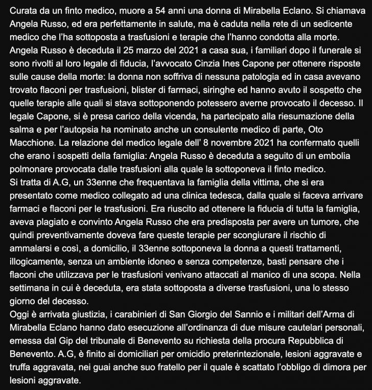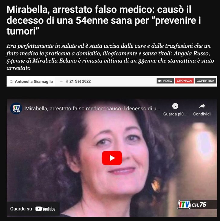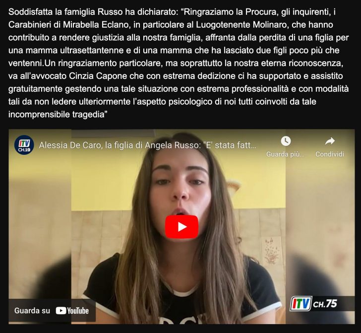 l’articolo su “ITV” del 21 Settembre 2022 in relazione alla morte di Angela Russo.