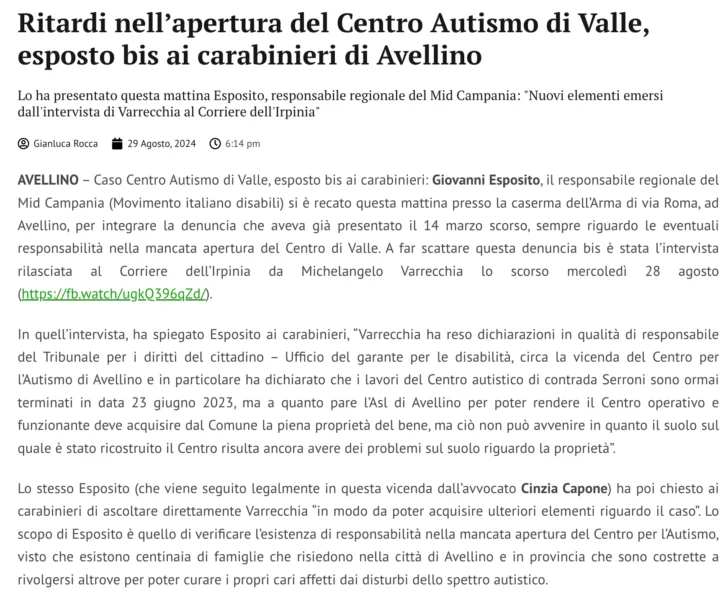 Condivido con voi l’articolo pubblicato su “Corriere Irpinia” in merito al caso del Centro per l’autismo.